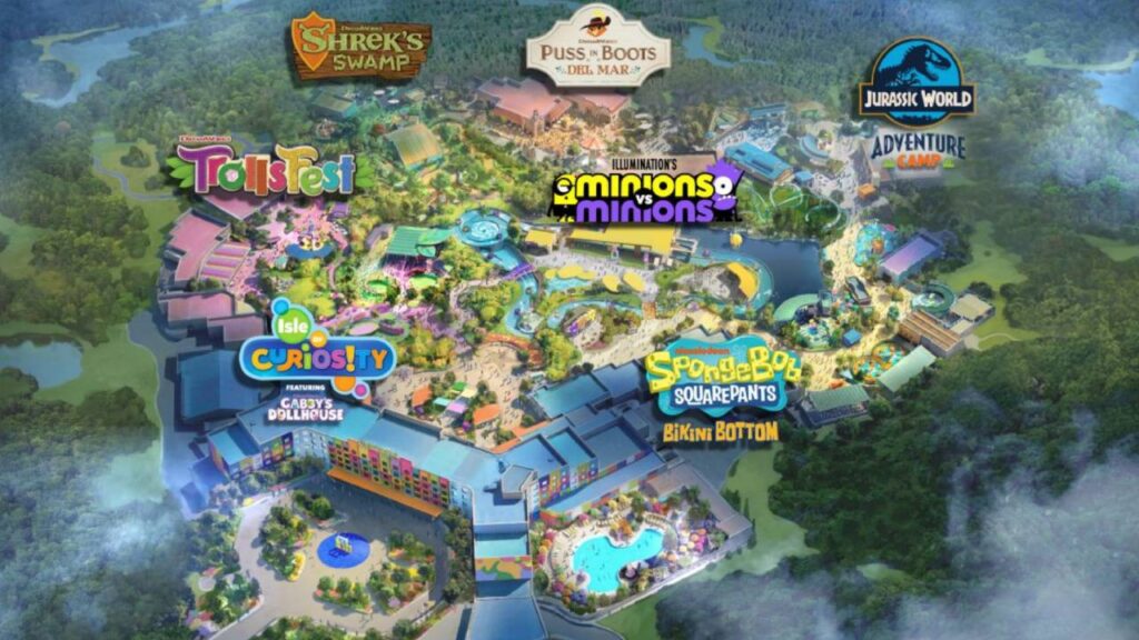 The lands will include DreamWorks’ Shrek’s Swamp, DreamWorks’ Puss in Boots Del Mar, Illumination’s Minions vs. Minions: Bello Bay Club, Jurassic World Adventure Camp, DreamWorks’ TrollsFest, Nickelodeon’s Spongebob SquarePants Bikini Bottom and Isle of Curiosity.